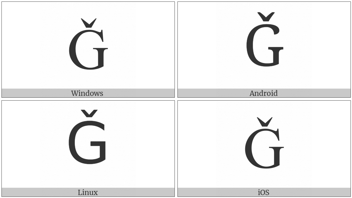 The image below shows how the “Latin Capital Letter G With Caron” symbol might look like on different operating systems. If the font in which this web site is displayed does not contain the symbol and there is no fallback font able to render it, you can use the image below to get an idea of what it should look like.