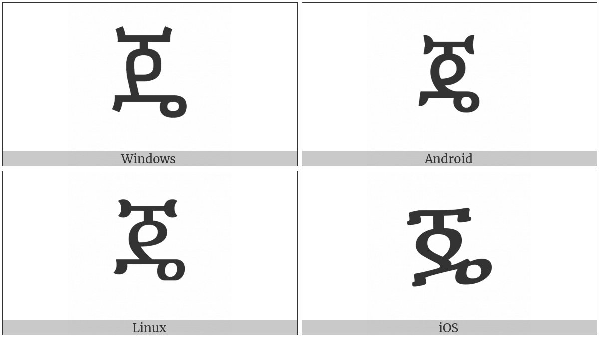 The image below shows how the “Ethiopic Syllable Jee” symbol might look like on different operating systems. If the font in which this web site is displayed does not contain the symbol and there is no fallback font able to render it, you can use the image below to get an idea of what it should look like.