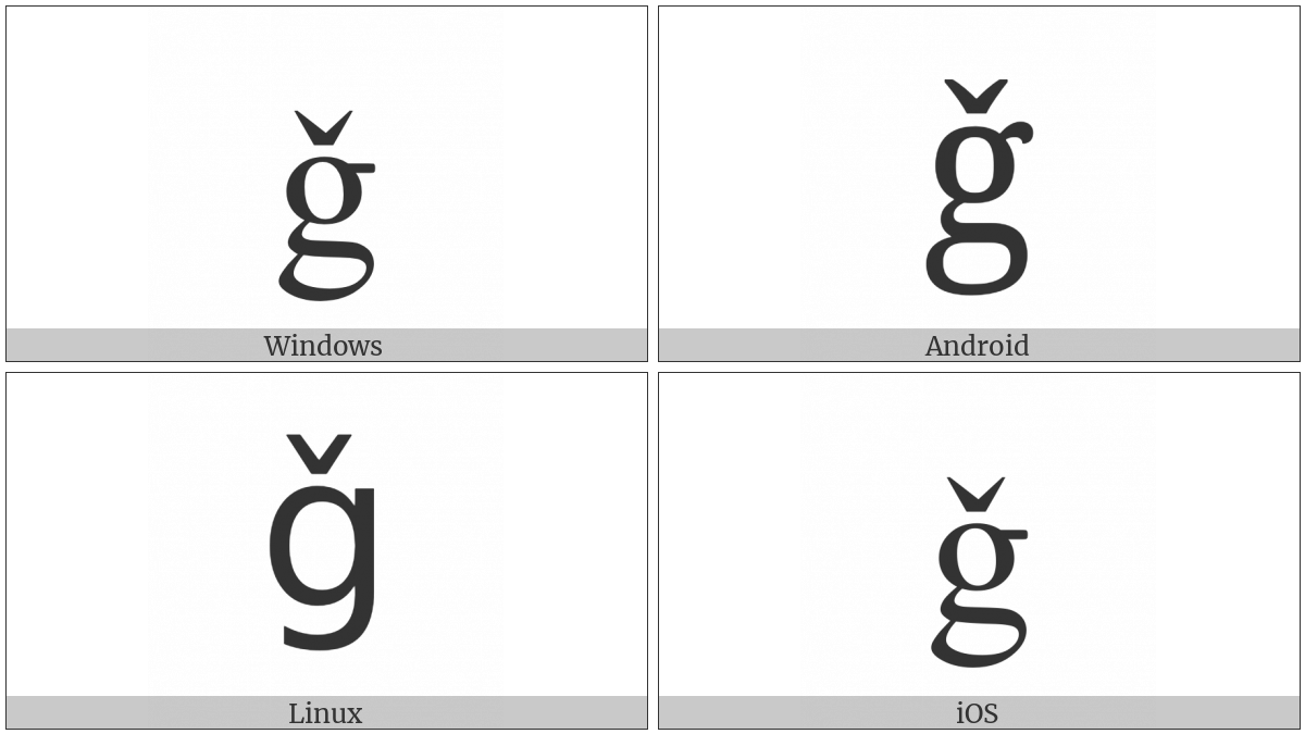 The image below shows how the “Latin Small Letter G With Caron” symbol might look like on different operating systems. If the font in which this web site is displayed does not contain the symbol and there is no fallback font able to render it, you can use the image below to get an idea of what it should look like.