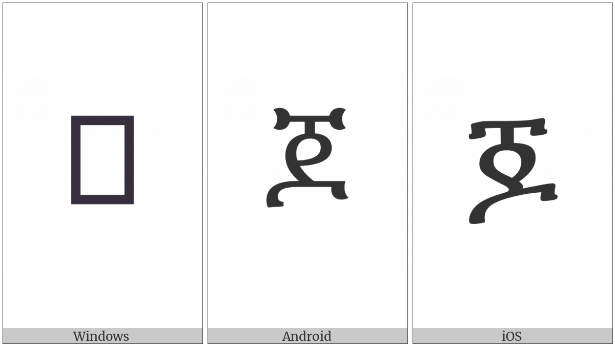 The image below shows how the “Ethiopic Syllable Jo” symbol might look like on different operating systems. If the font in which this web site is displayed does not contain the symbol and there is no fallback font able to render it, you can use the image below to get an idea of what it should look like.