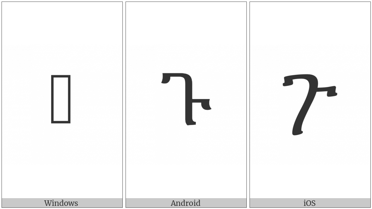 The image below shows how the “Ethiopic Syllable Gu” symbol might look like on different operating systems. If the font in which this web site is displayed does not contain the symbol and there is no fallback font able to render it, you can use the image below to get an idea of what it should look like.