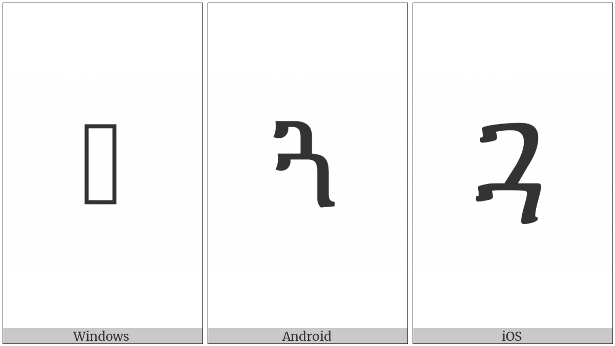 The image below shows how the “Ethiopic Syllable Gwaa” symbol might look like on different operating systems. If the font in which this web site is displayed does not contain the symbol and there is no fallback font able to render it, you can use the image below to get an idea of what it should look like.