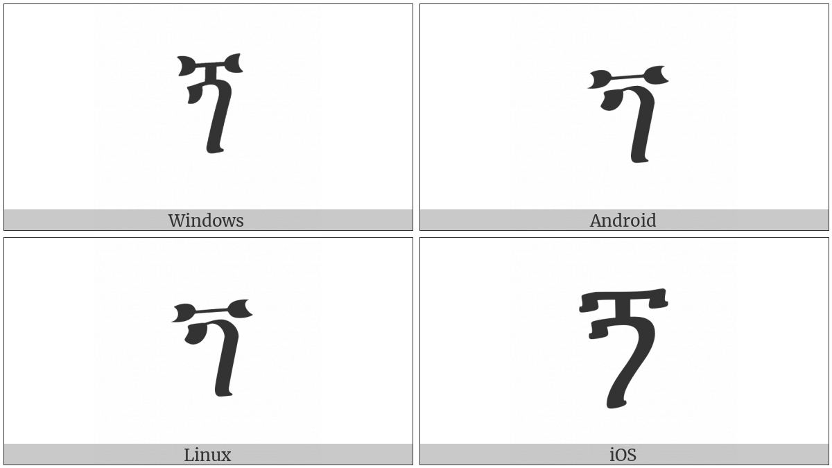 The image below shows how the “Ethiopic Syllable Gga” symbol might look like on different operating systems. If the font in which this web site is displayed does not contain the symbol and there is no fallback font able to render it, you can use the image below to get an idea of what it should look like.