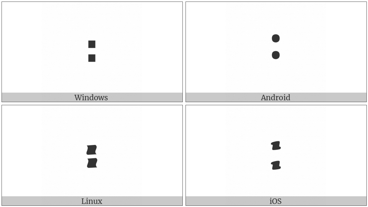 The image below shows how the “Ethiopic Wordspace” symbol might look like on different operating systems. If the font in which this web site is displayed does not contain the symbol and there is no fallback font able to render it, you can use the image below to get an idea of what it should look like.