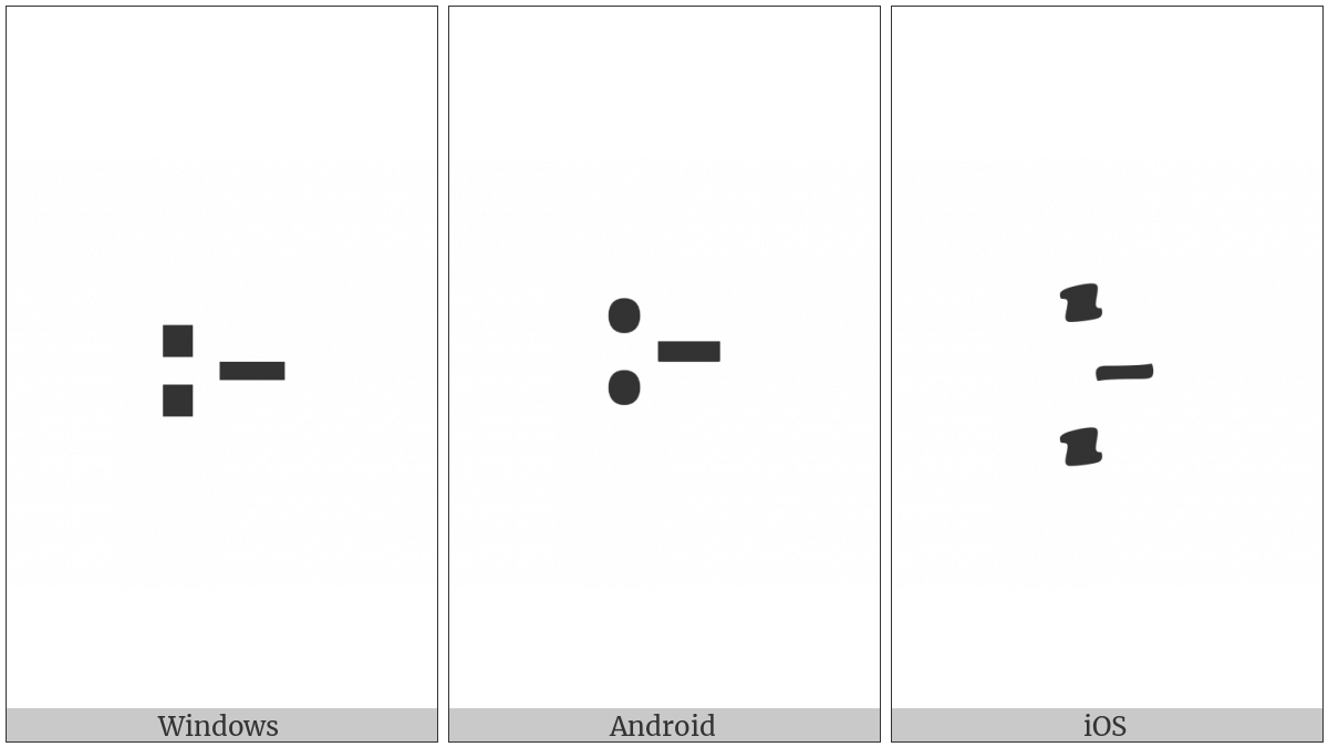 The image below shows how the “Ethiopic Preface Colon” symbol might look like on different operating systems. If the font in which this web site is displayed does not contain the symbol and there is no fallback font able to render it, you can use the image below to get an idea of what it should look like.