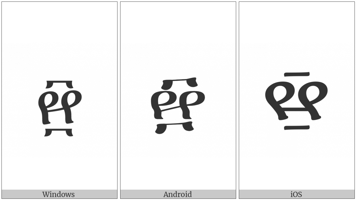 The image below shows how the “Ethiopic Number Ten Thousand” symbol might look like on different operating systems. If the font in which this web site is displayed does not contain the symbol and there is no fallback font able to render it, you can use the image below to get an idea of what it should look like.