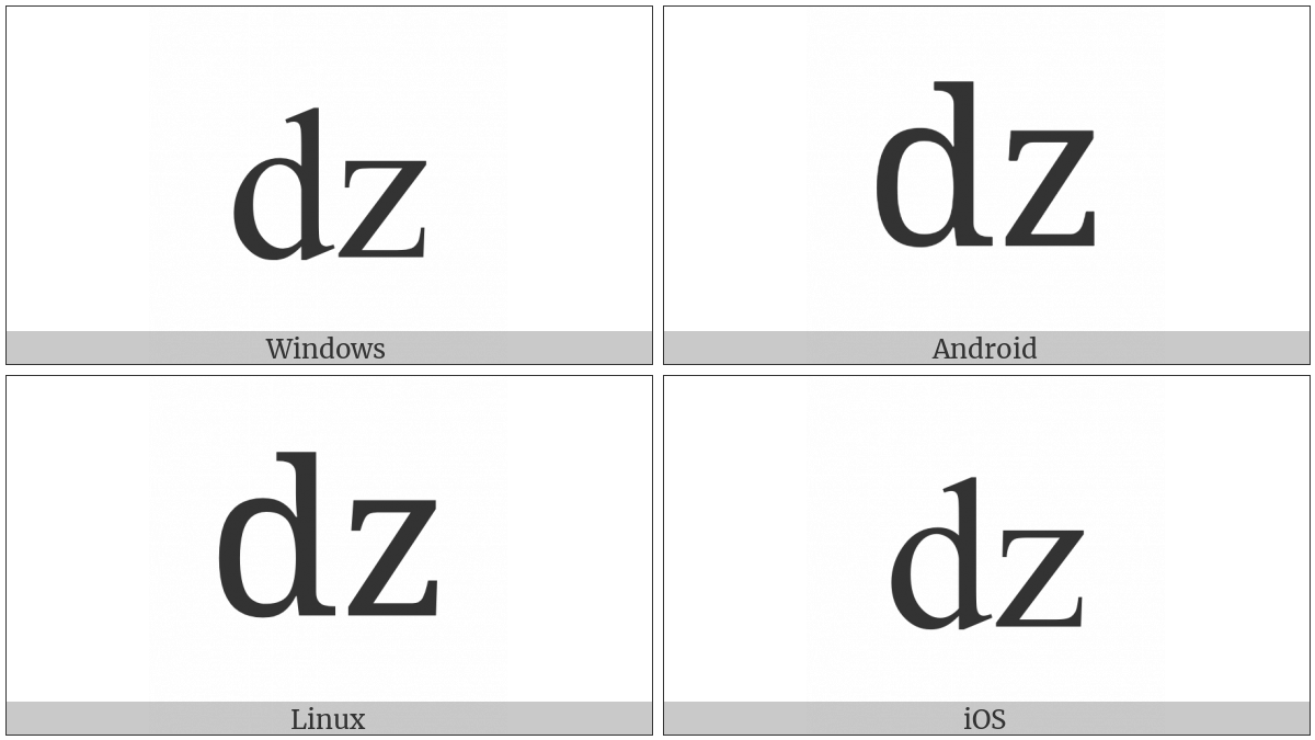The image below shows how the “Latin Small Letter Dz” symbol might look like on different operating systems. If the font in which this web site is displayed does not contain the symbol and there is no fallback font able to render it, you can use the image below to get an idea of what it should look like.