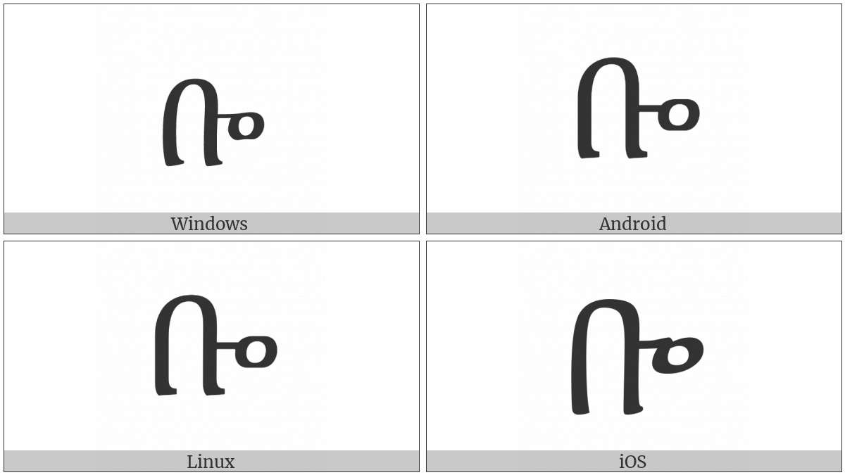The image below shows how the “Ethiopic Syllable Sebatbeit Bwa” symbol might look like on different operating systems. If the font in which this web site is displayed does not contain the symbol and there is no fallback font able to render it, you can use the image below to get an idea of what it should look like.
