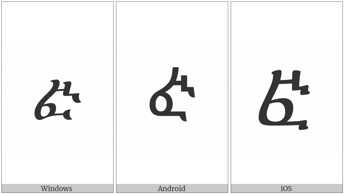 The image below shows how the “Ethiopic Syllable Fwi” symbol might look like on different operating systems. If the font in which this web site is displayed does not contain the symbol and there is no fallback font able to render it, you can use the image below to get an idea of what it should look like.