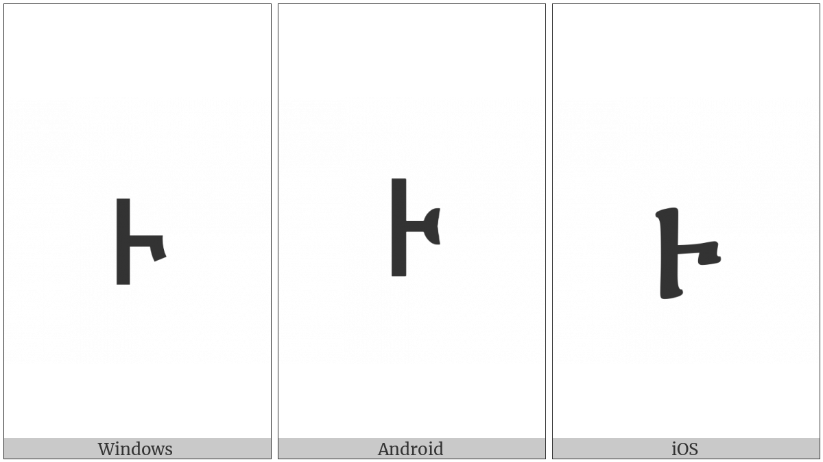 The image below shows how the “Ethiopic Tonal Mark Kurt” symbol might look like on different operating systems. If the font in which this web site is displayed does not contain the symbol and there is no fallback font able to render it, you can use the image below to get an idea of what it should look like.