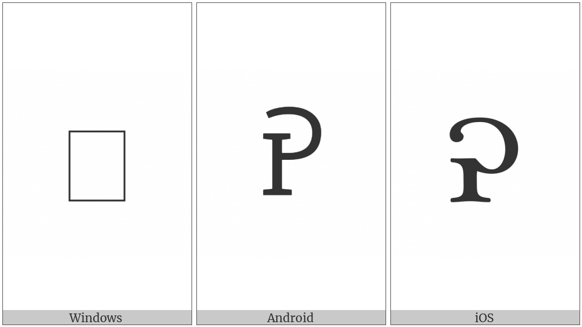The image below shows how the “Cherokee Letter He” symbol might look like on different operating systems. If the font in which this web site is displayed does not contain the symbol and there is no fallback font able to render it, you can use the image below to get an idea of what it should look like.