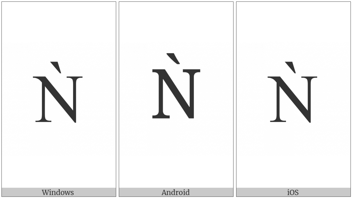 The image below shows how the “Latin Capital Letter N With Grave” symbol might look like on different operating systems. If the font in which this web site is displayed does not contain the symbol and there is no fallback font able to render it, you can use the image below to get an idea of what it should look like.