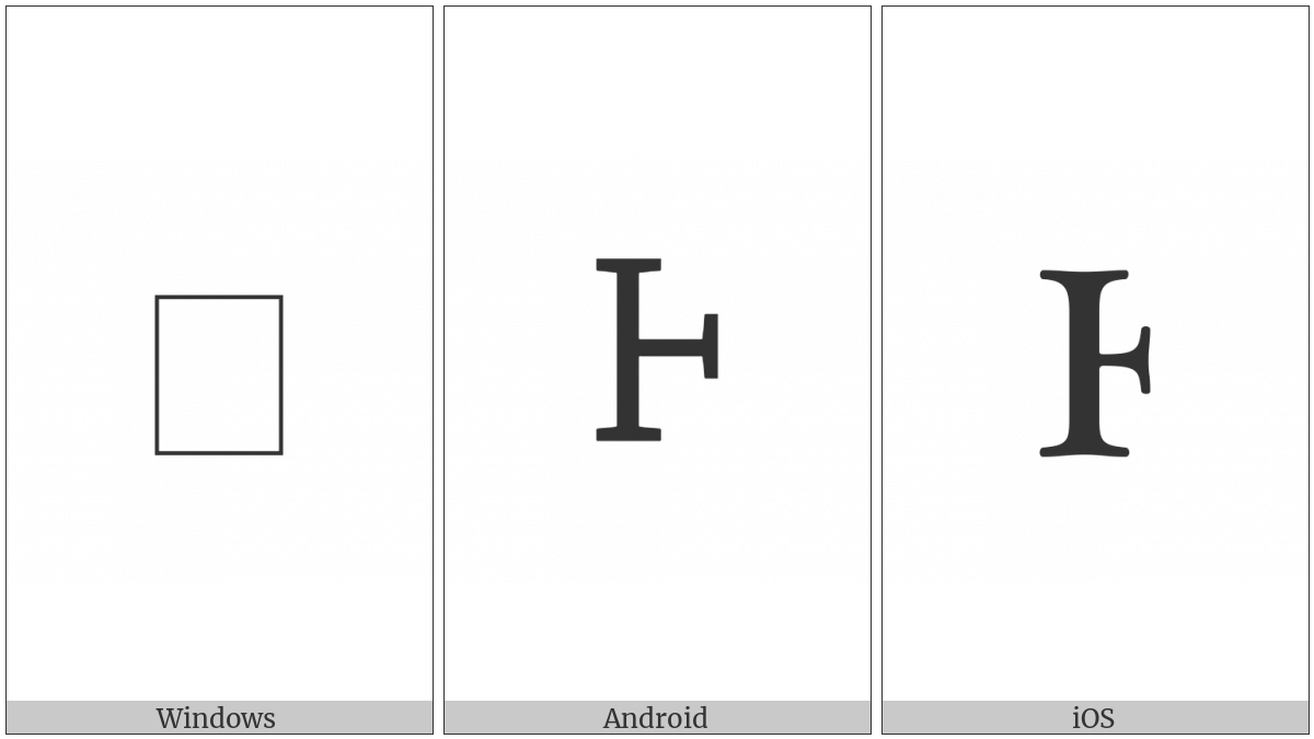 The image below shows how the “Cherokee Letter Ho” symbol might look like on different operating systems. If the font in which this web site is displayed does not contain the symbol and there is no fallback font able to render it, you can use the image below to get an idea of what it should look like.
