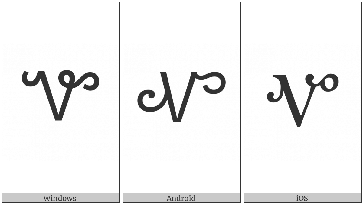 The image below shows how the “Cherokee Letter Quo” symbol might look like on different operating systems. If the font in which this web site is displayed does not contain the symbol and there is no fallback font able to render it, you can use the image below to get an idea of what it should look like.
