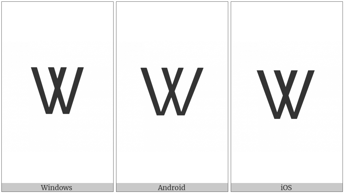 The image below shows how the “Cherokee Letter Ta” symbol might look like on different operating systems. If the font in which this web site is displayed does not contain the symbol and there is no fallback font able to render it, you can use the image below to get an idea of what it should look like.