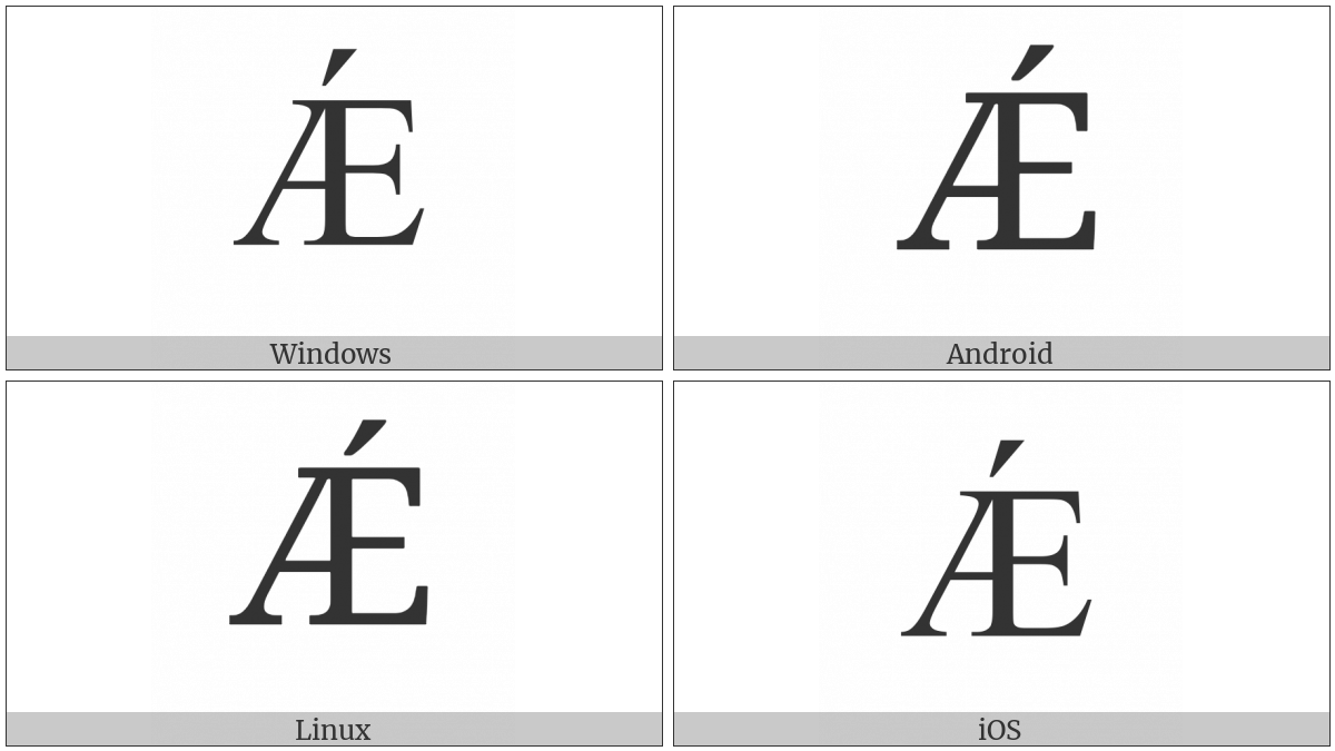 The image below shows how the “Latin Capital Letter Ae With Acute” symbol might look like on different operating systems. If the font in which this web site is displayed does not contain the symbol and there is no fallback font able to render it, you can use the image below to get an idea of what it should look like.