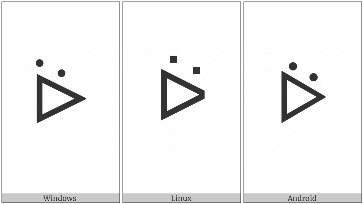 The image below shows how the “Canadian Syllabics Naskapi Woo” symbol might look like on different operating systems. If the font in which this web site is displayed does not contain the symbol and there is no fallback font able to render it, you can use the image below to get an idea of what it should look like.