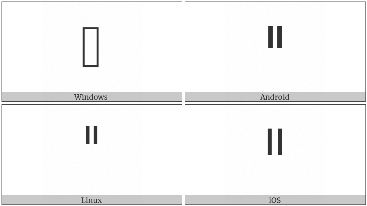The image below shows how the “Canadian Syllabics Final Double Short Vertical Strokes” symbol might look like on different operating systems. If the font in which this web site is displayed does not contain the symbol and there is no fallback font able to render it, you can use the image below to get an idea of what it should look like.