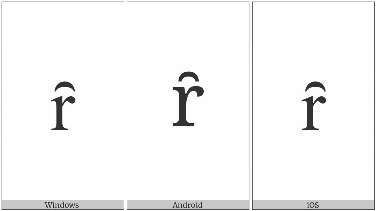 The image below shows how the “Latin Small Letter R With Inverted Breve” symbol might look like on different operating systems. If the font in which this web site is displayed does not contain the symbol and there is no fallback font able to render it, you can use the image below to get an idea of what it should look like.