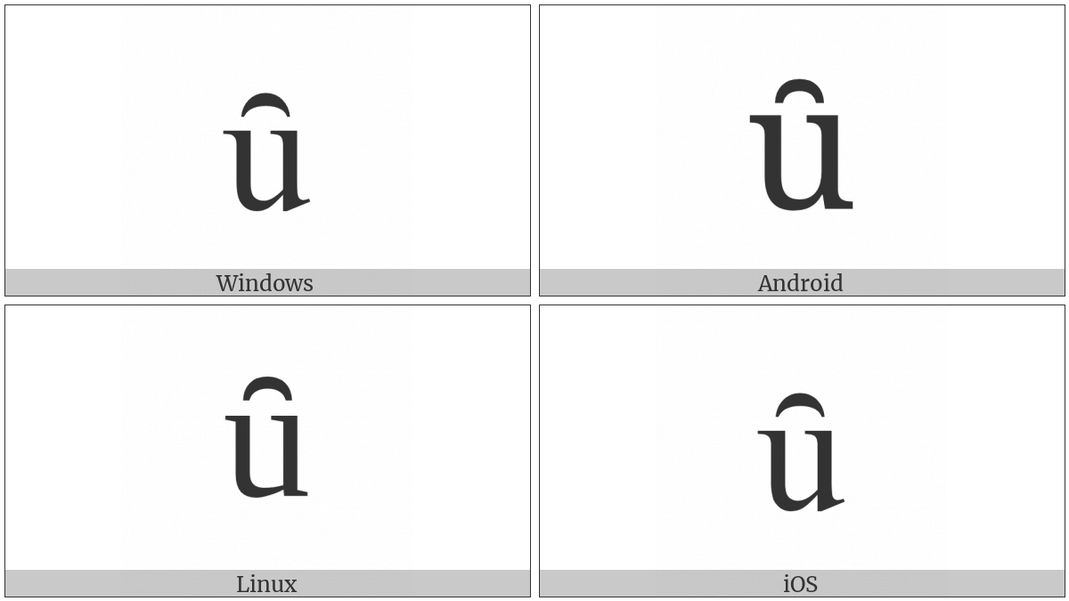 The image below shows how the “Latin Small Letter U With Inverted Breve” symbol might look like on different operating systems. If the font in which this web site is displayed does not contain the symbol and there is no fallback font able to render it, you can use the image below to get an idea of what it should look like.