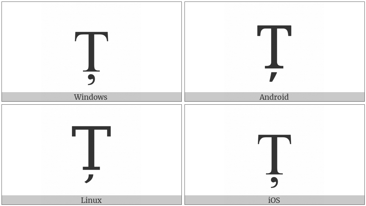 The image below shows how the “Latin Capital Letter T With Comma Below” symbol might look like on different operating systems. If the font in which this web site is displayed does not contain the symbol and there is no fallback font able to render it, you can use the image below to get an idea of what it should look like.