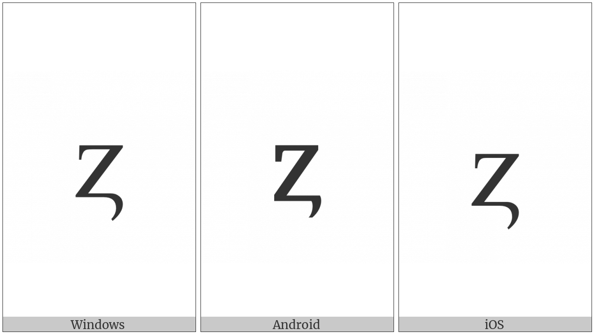 The image below shows how the “Latin Small Letter Z With Hook” symbol might look like on different operating systems. If the font in which this web site is displayed does not contain the symbol and there is no fallback font able to render it, you can use the image below to get an idea of what it should look like.