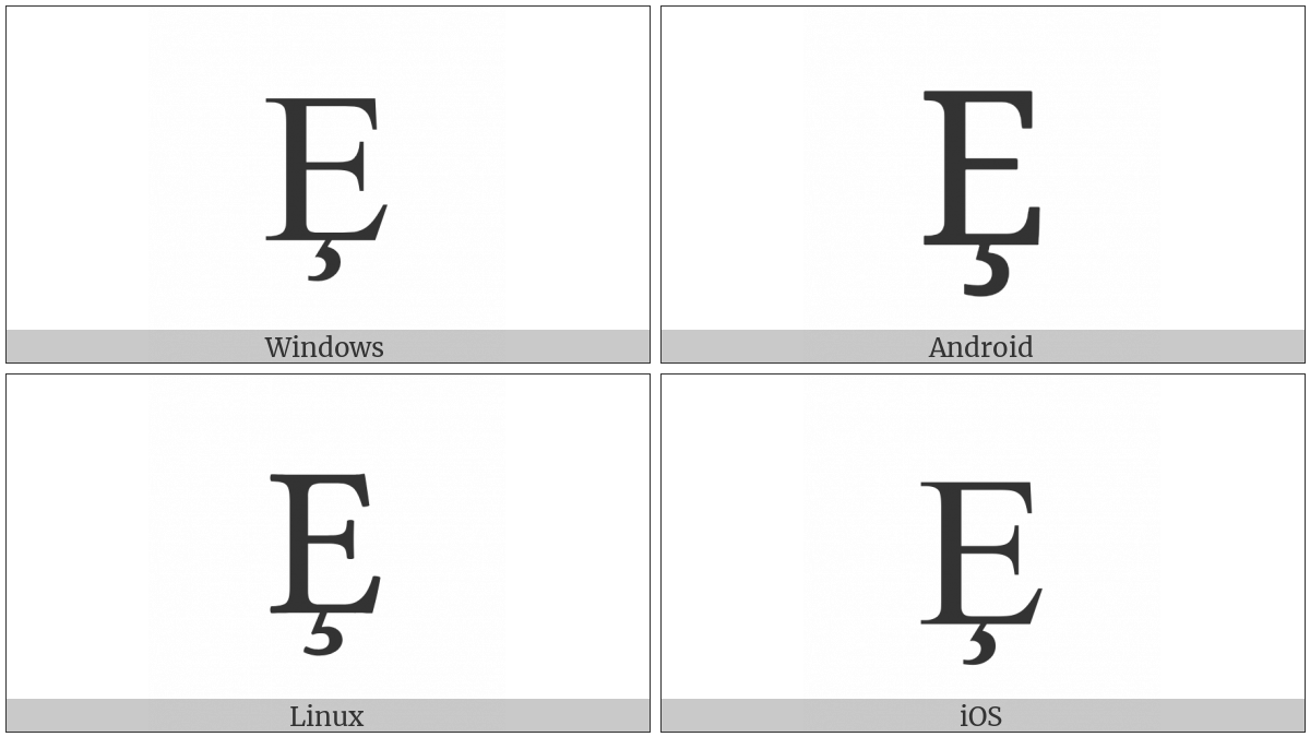 The image below shows how the “Latin Capital Letter E With Cedilla” symbol might look like on different operating systems. If the font in which this web site is displayed does not contain the symbol and there is no fallback font able to render it, you can use the image below to get an idea of what it should look like.