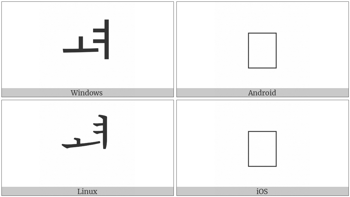 The image below shows how the “Hangul Jungseong O-Yeo” symbol might look like on different operating systems. If the font in which this web site is displayed does not contain the symbol and there is no fallback font able to render it, you can use the image below to get an idea of what it should look like.