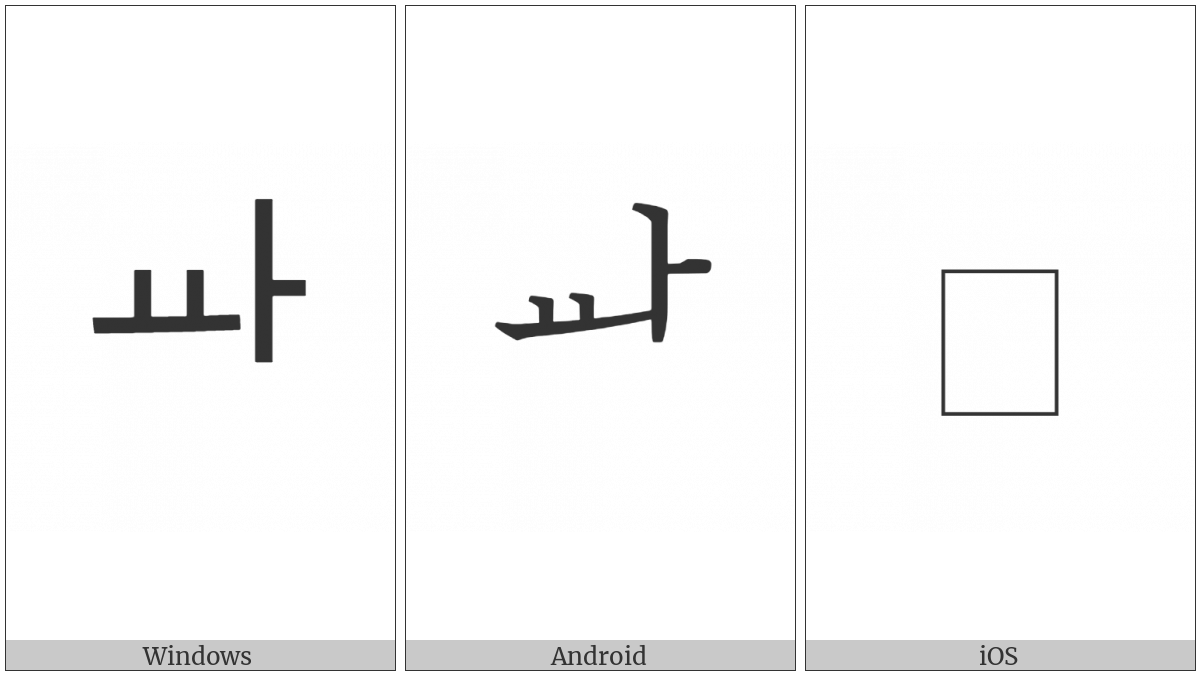 The image below shows how the “Hangul Jungseong Yo-A” symbol might look like on different operating systems. If the font in which this web site is displayed does not contain the symbol and there is no fallback font able to render it, you can use the image below to get an idea of what it should look like.