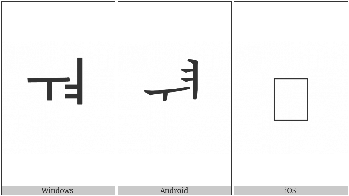 The image below shows how the “Hangul Jungseong U-Yeo” symbol might look like on different operating systems. If the font in which this web site is displayed does not contain the symbol and there is no fallback font able to render it, you can use the image below to get an idea of what it should look like.
