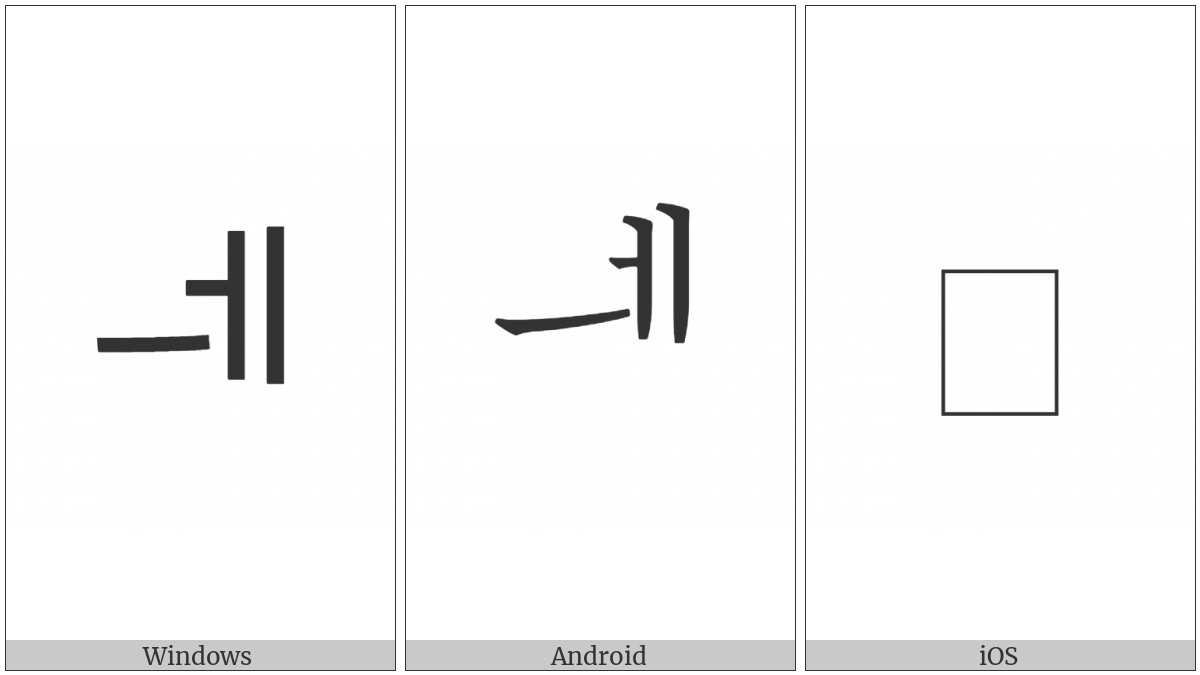 The image below shows how the “Hangul Jungseong Eu-E” symbol might look like on different operating systems. If the font in which this web site is displayed does not contain the symbol and there is no fallback font able to render it, you can use the image below to get an idea of what it should look like.