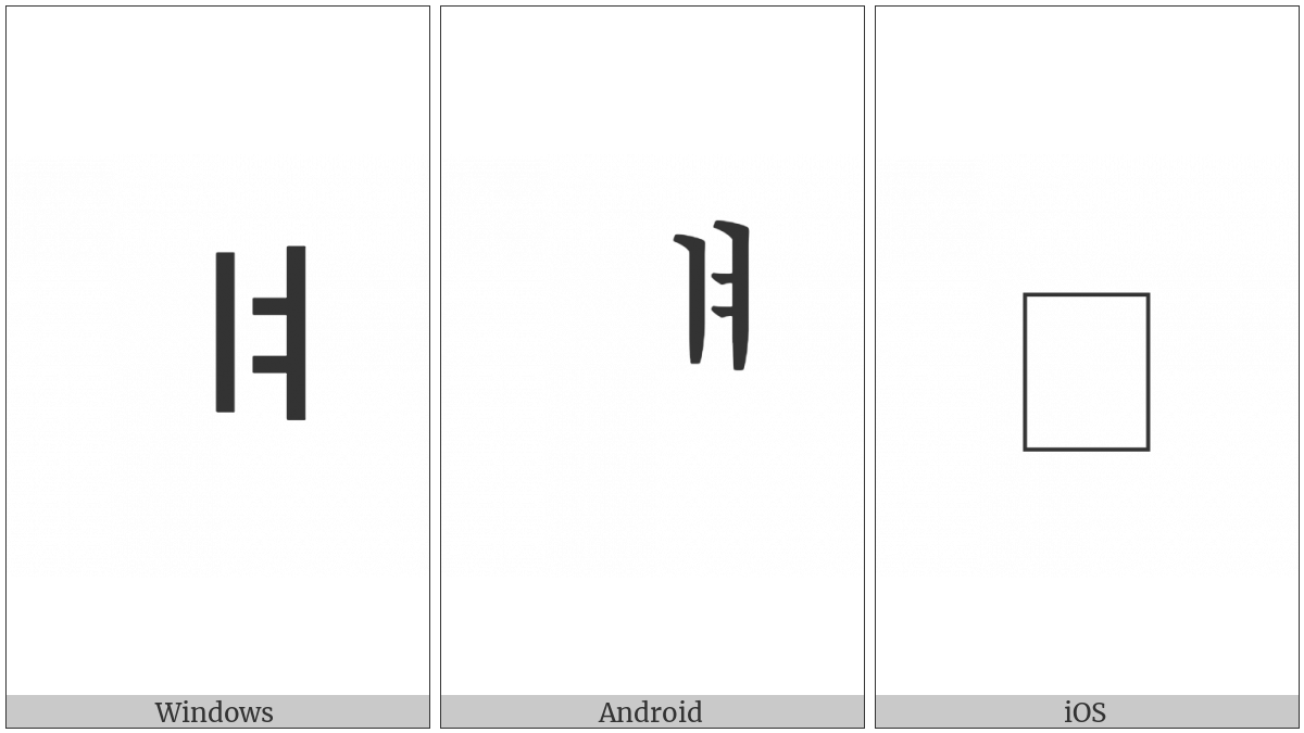 The image below shows how the “Hangul Jungseong I-Yeo” symbol might look like on different operating systems. If the font in which this web site is displayed does not contain the symbol and there is no fallback font able to render it, you can use the image below to get an idea of what it should look like.