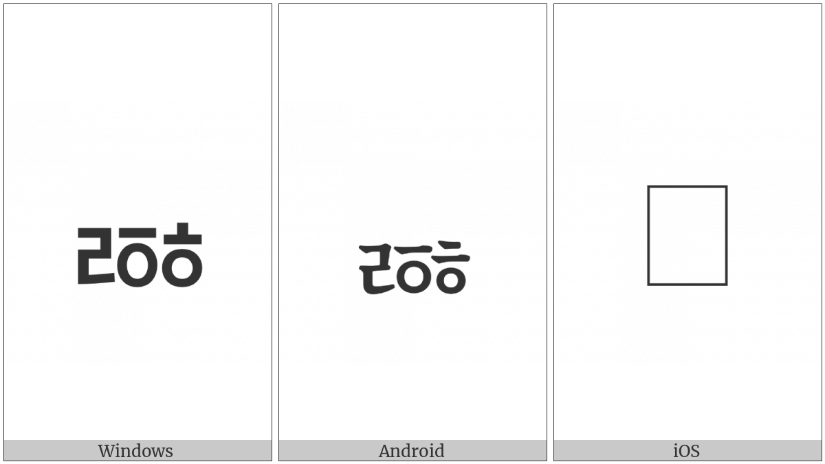The image below shows how the “Hangul Jongseong Rieul-Yeorinhieuh-Hieuh” symbol might look like on different operating systems. If the font in which this web site is displayed does not contain the symbol and there is no fallback font able to render it, you can use the image below to get an idea of what it should look like.