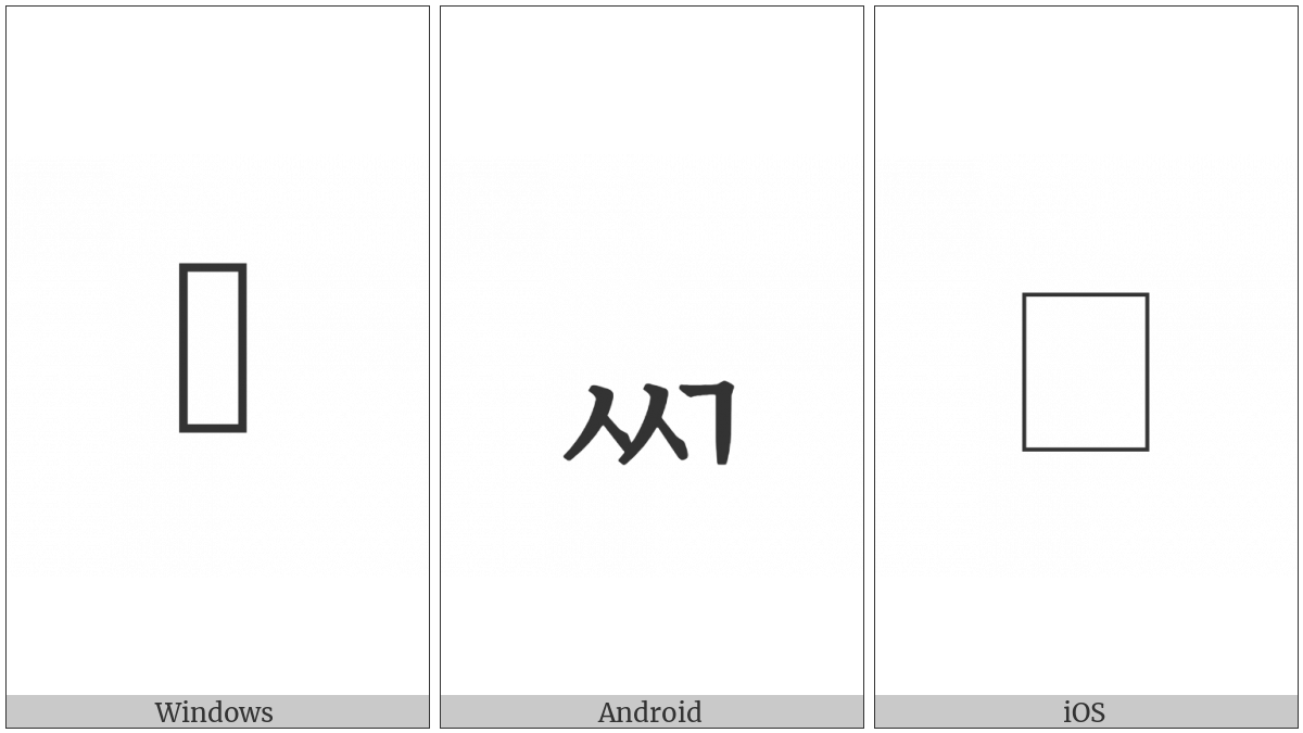 The image below shows how the “Hangul Jongseong Ssangsios-Kiyeok” symbol might look like on different operating systems. If the font in which this web site is displayed does not contain the symbol and there is no fallback font able to render it, you can use the image below to get an idea of what it should look like.