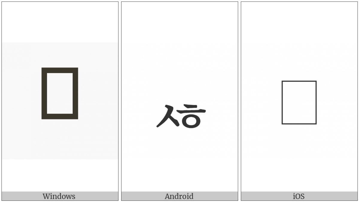 The image below shows how the “Hangul Jongseong Sios-Hieuh” symbol might look like on different operating systems. If the font in which this web site is displayed does not contain the symbol and there is no fallback font able to render it, you can use the image below to get an idea of what it should look like.