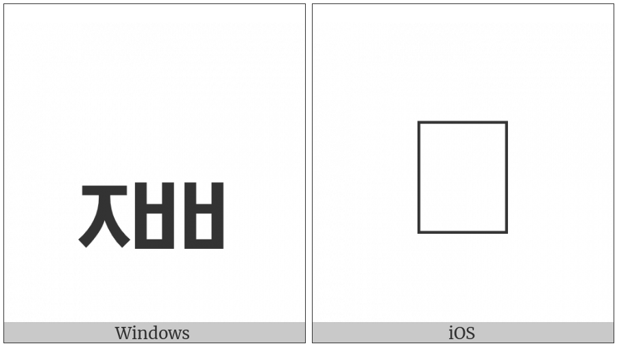 The image below shows how the “Hangul Jongseong Cieuc-Ssangpieup” symbol might look like on different operating systems. If the font in which this web site is displayed does not contain the symbol and there is no fallback font able to render it, you can use the image below to get an idea of what it should look like.