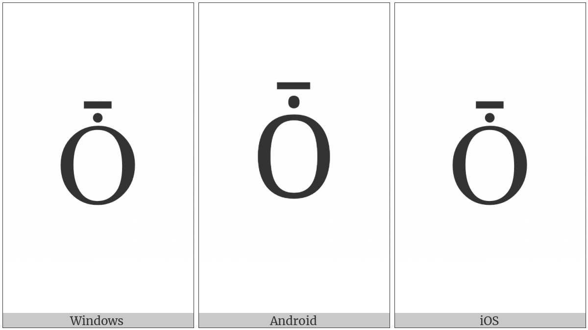 The image below shows how the “Latin Capital Letter O With Dot Above And Macron” symbol might look like on different operating systems. If the font in which this web site is displayed does not contain the symbol and there is no fallback font able to render it, you can use the image below to get an idea of what it should look like.