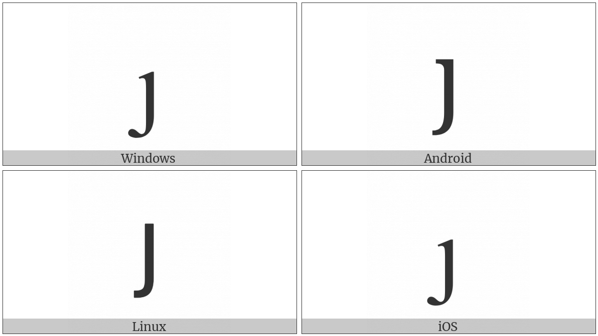 The image below shows how the “Latin Small Letter Dotless J” symbol might look like on different operating systems. If the font in which this web site is displayed does not contain the symbol and there is no fallback font able to render it, you can use the image below to get an idea of what it should look like.
