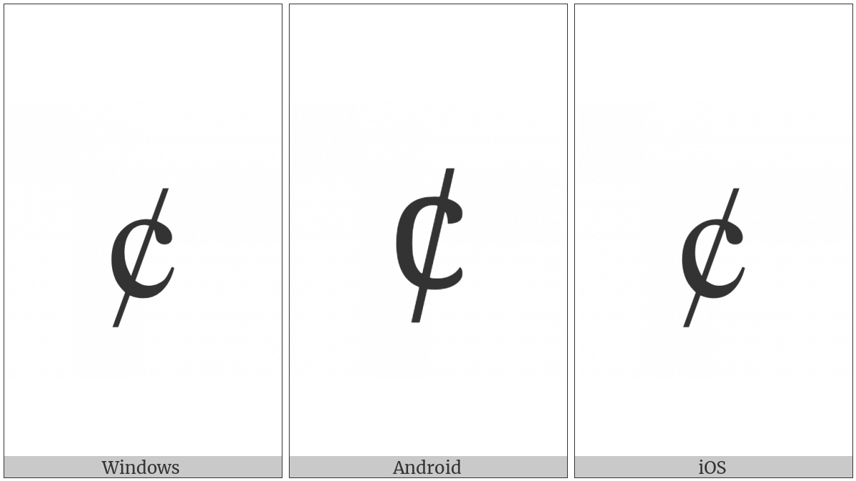 The image below shows how the “Latin Small Letter C With Stroke” symbol might look like on different operating systems. If the font in which this web site is displayed does not contain the symbol and there is no fallback font able to render it, you can use the image below to get an idea of what it should look like.