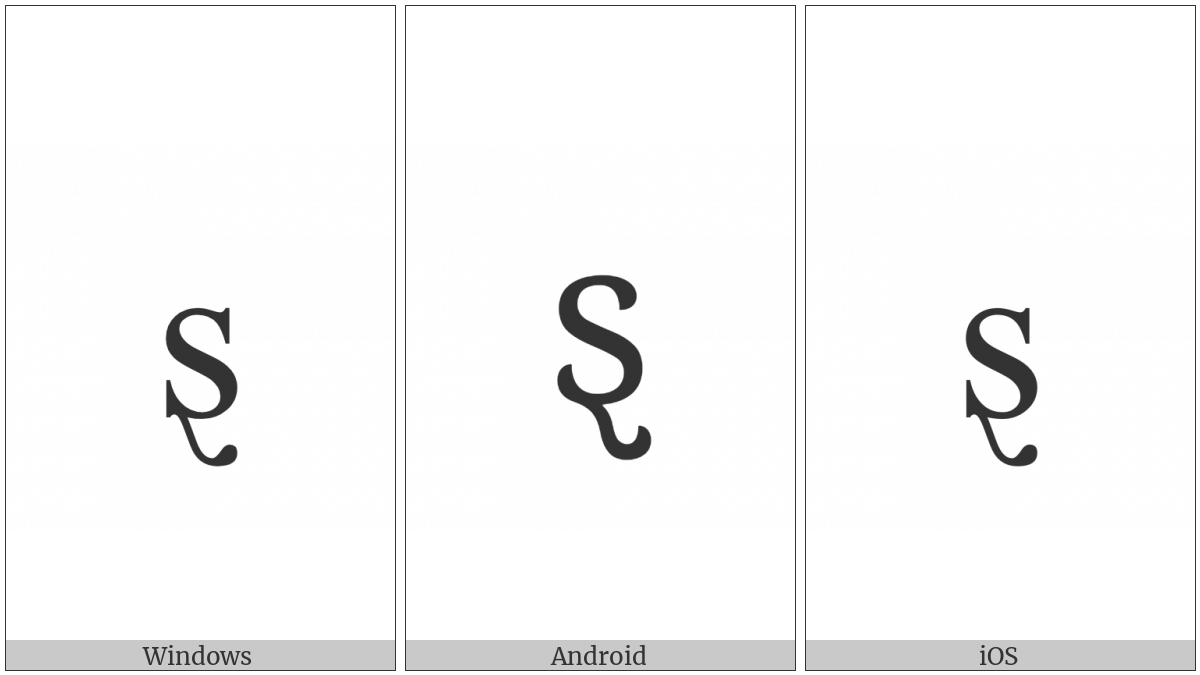 The image below shows how the “Latin Small Letter S With Swash Tail” symbol might look like on different operating systems. If the font in which this web site is displayed does not contain the symbol and there is no fallback font able to render it, you can use the image below to get an idea of what it should look like.