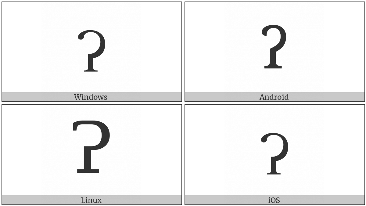 The image below shows how the “Latin Capital Letter Glottal Stop” symbol might look like on different operating systems. If the font in which this web site is displayed does not contain the symbol and there is no fallback font able to render it, you can use the image below to get an idea of what it should look like.