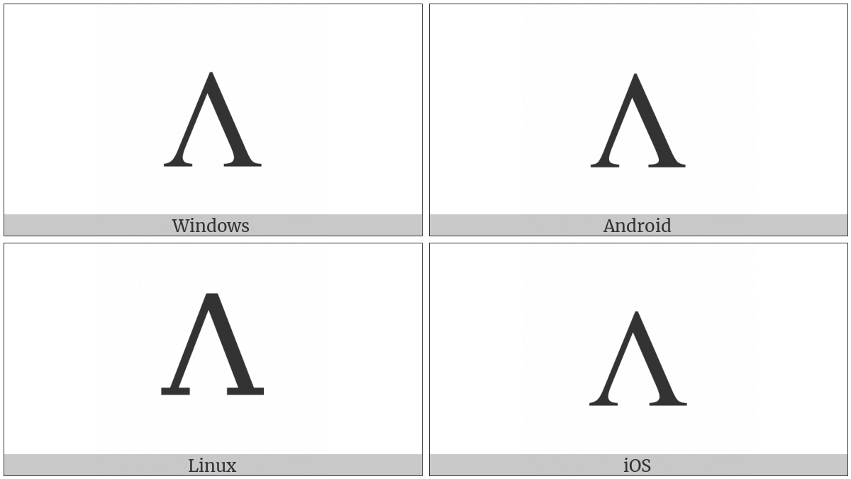 The image below shows how the “Latin Capital Letter Turned V” symbol might look like on different operating systems. If the font in which this web site is displayed does not contain the symbol and there is no fallback font able to render it, you can use the image below to get an idea of what it should look like.