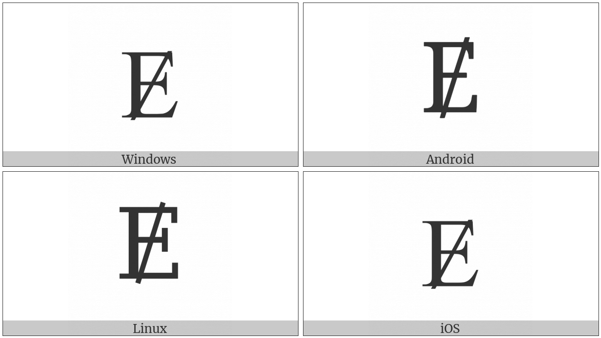The image below shows how the “Latin Capital Letter E With Stroke” symbol might look like on different operating systems. If the font in which this web site is displayed does not contain the symbol and there is no fallback font able to render it, you can use the image below to get an idea of what it should look like.