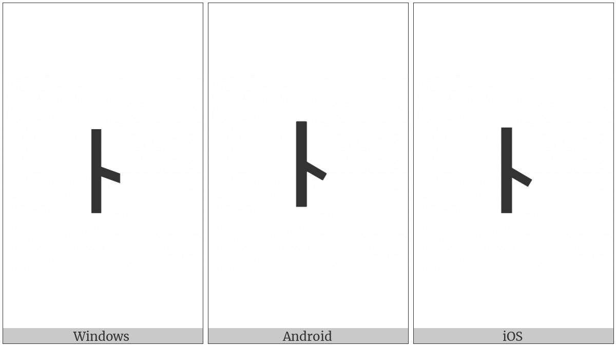 The image below shows how the “Runic Letter Short-Twig-Naud N” symbol might look like on different operating systems. If the font in which this web site is displayed does not contain the symbol and there is no fallback font able to render it, you can use the image below to get an idea of what it should look like.