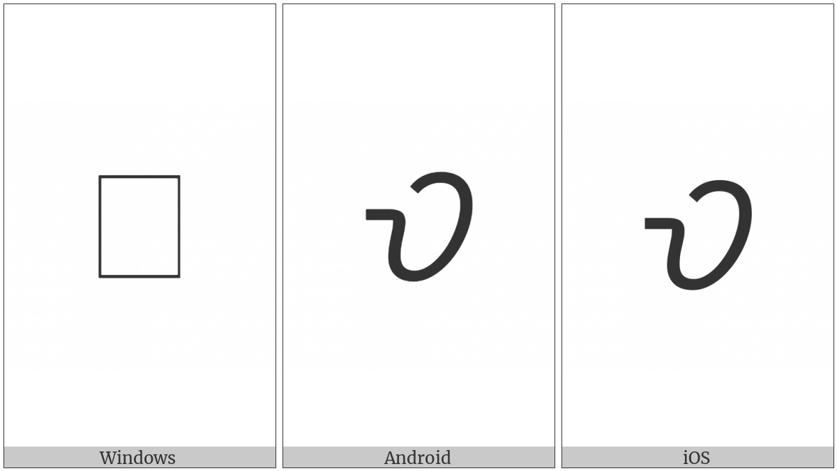 The image below shows how the “Tagalog Letter Wa” symbol might look like on different operating systems. If the font in which this web site is displayed does not contain the symbol and there is no fallback font able to render it, you can use the image below to get an idea of what it should look like.