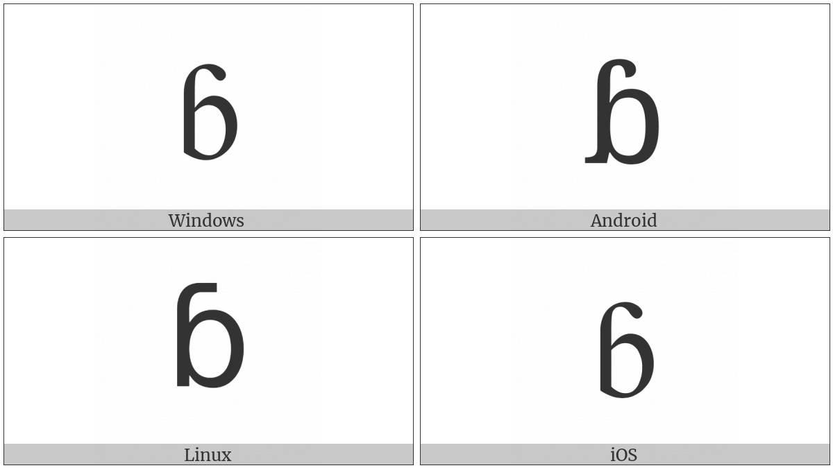 The image below shows how the “Latin Small Letter B With Hook” symbol might look like on different operating systems. If the font in which this web site is displayed does not contain the symbol and there is no fallback font able to render it, you can use the image below to get an idea of what it should look like.