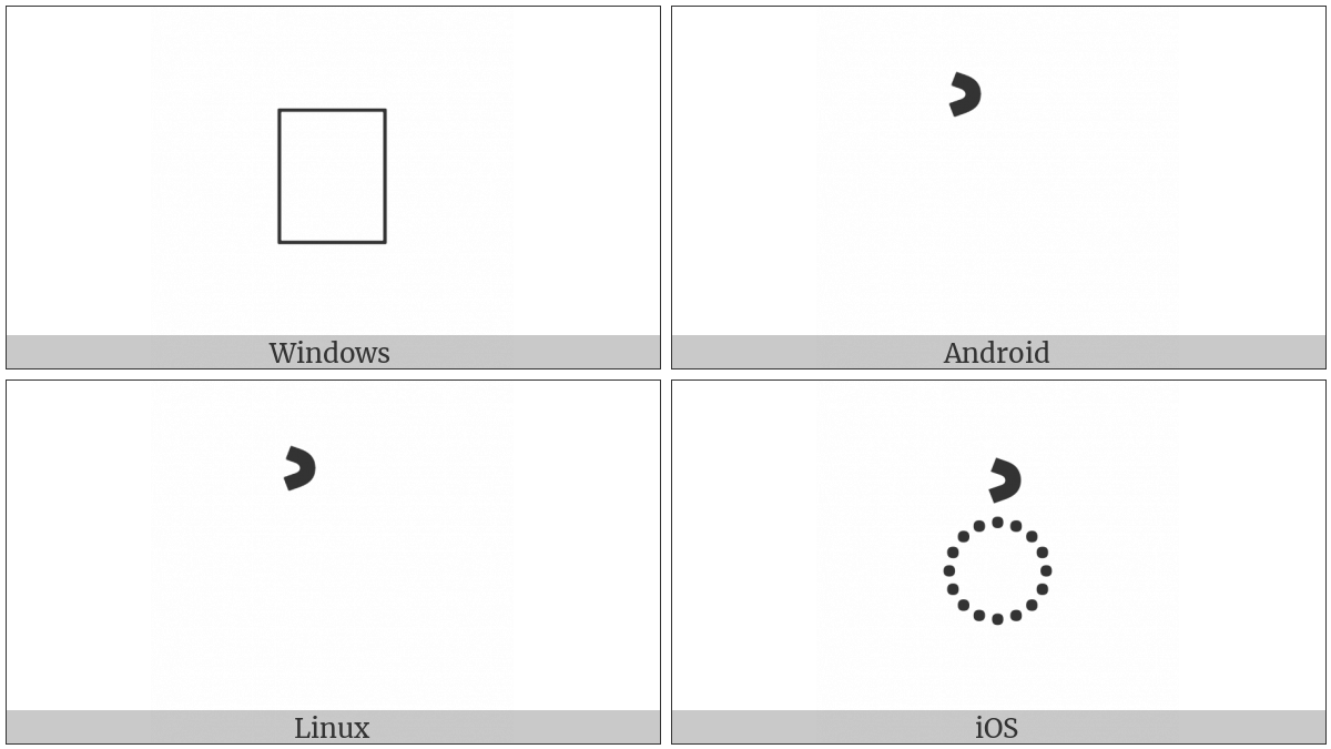 The image below shows how the “Tagbanwa Vowel Sign I” symbol might look like on different operating systems. If the font in which this web site is displayed does not contain the symbol and there is no fallback font able to render it, you can use the image below to get an idea of what it should look like.