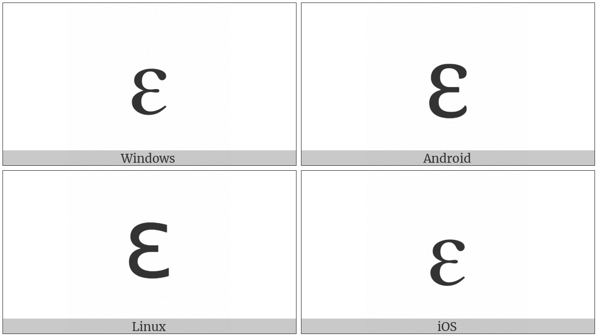 The image below shows how the “Latin Small Letter Open E” symbol might look like on different operating systems. If the font in which this web site is displayed does not contain the symbol and there is no fallback font able to render it, you can use the image below to get an idea of what it should look like.