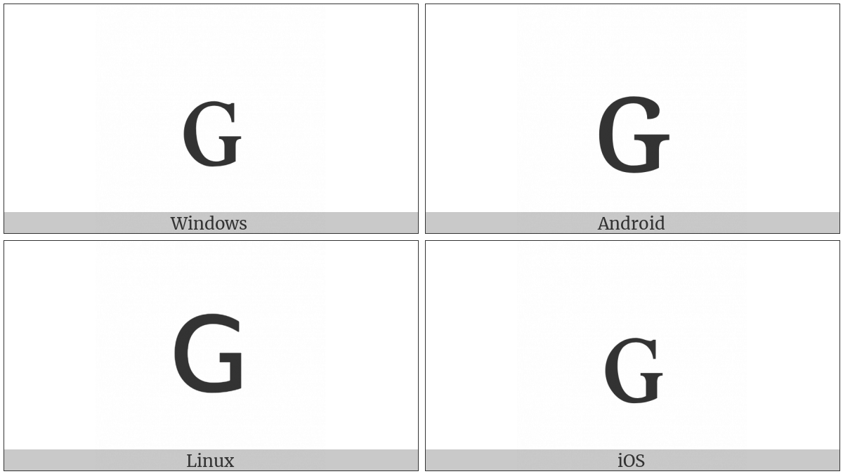 The image below shows how the “Latin Letter Small Capital G” symbol might look like on different operating systems. If the font in which this web site is displayed does not contain the symbol and there is no fallback font able to render it, you can use the image below to get an idea of what it should look like.