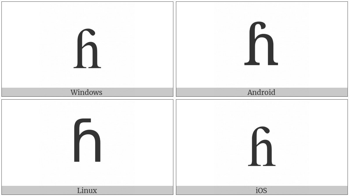 The image below shows how the “Latin Small Letter H With Hook” symbol might look like on different operating systems. If the font in which this web site is displayed does not contain the symbol and there is no fallback font able to render it, you can use the image below to get an idea of what it should look like.